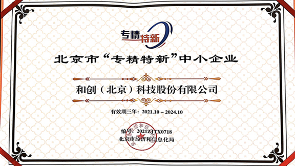 和創科技憑借技術突破、產品創新、細分市場優勢及拓展潛力等多方面優勢,榮獲北京市經濟和信息化局2021年度第二批認定的專精特新“小巨人”企業榮譽稱號。