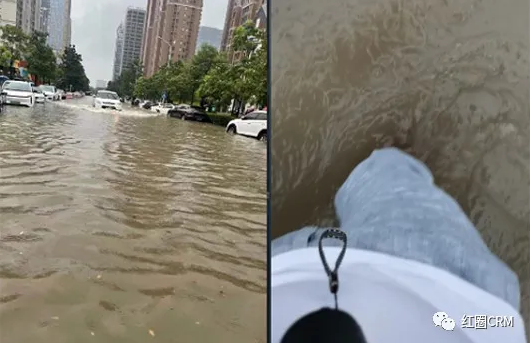 16點,紅圈運營團(tuán)隊的幾名同事剛剛結(jié)束對一家客戶拜訪,正在前往另一家客戶的路上,此時雨水已經(jīng)淹沒膝蓋。