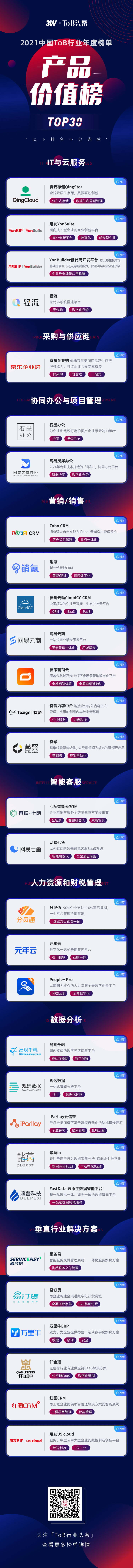 此次評選共歷時2個月,由「ToB行業(yè)頭條」聯(lián)手3W集團(tuán)、50+投資機(jī)構(gòu)及行業(yè)專家,從產(chǎn)品質(zhì)量、技術(shù)應(yīng)用、研發(fā)投入、用戶規(guī)模和產(chǎn)品復(fù)購率等多個維度對參評產(chǎn)品進(jìn)行綜合評判,最終從報(bào)名及推薦參選的100多家產(chǎn)品中挑選出了最具市場價值的ToB產(chǎn)品TOP30。
