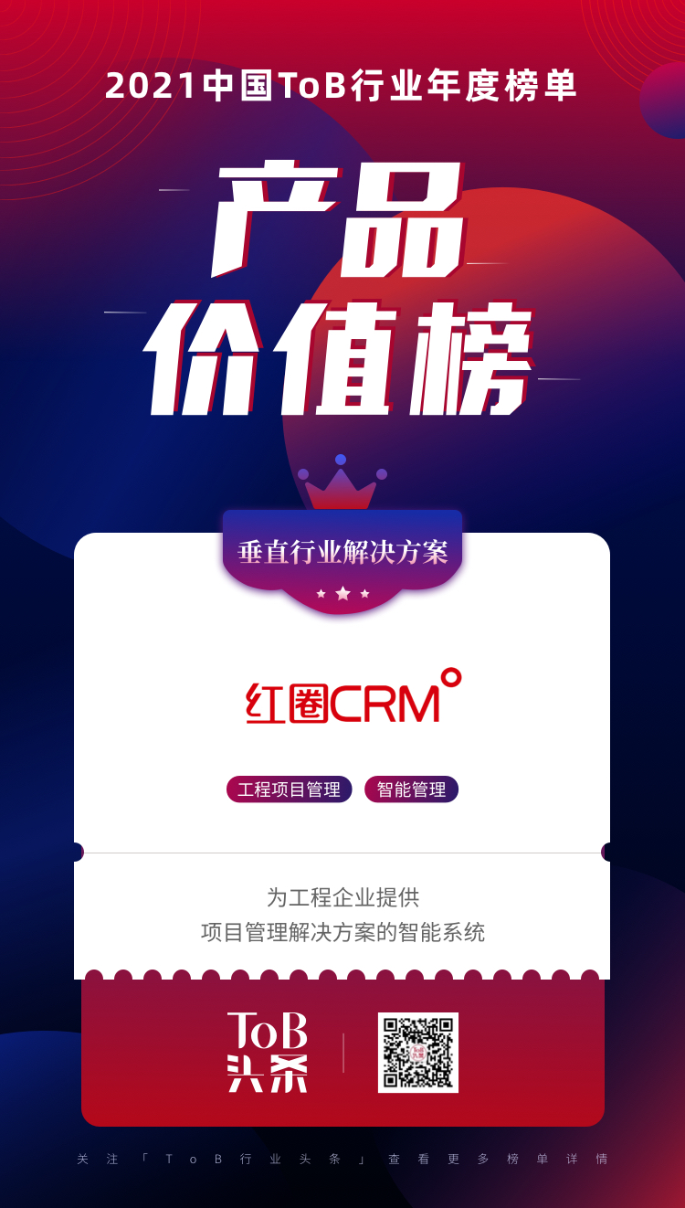 2022年1月4日,「ToB行業(yè)頭條」聯(lián)手3W集團(tuán)正式發(fā)布了《2021ToB行業(yè)年度榜單·產(chǎn)品價值榜》,紅圈CRM工程項(xiàng)目管理系統(tǒng)榮登最具市場價值的ToB產(chǎn)品TOP30榜單!