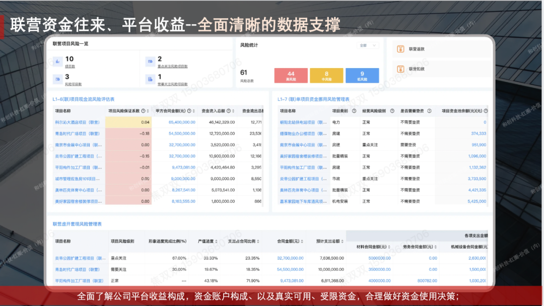 當(dāng)前公司數(shù)字化程度較低,通過簡單的oa軟件、Excel表格、微信群、例會等傳統(tǒng)的管理方式進(jìn)行管理。近幾年隨著公司省外業(yè)務(wù)的拓展,項目越來越大,傳統(tǒng)的低效管理模式已經(jīng)無法滿足日常的管理需求。公司聯(lián)營項目較多,個別項目出現(xiàn)資金挪用,虛開套現(xiàn),造成不必要的法律訴訟官司,甚至資金賬戶被凍結(jié)。此外,公司自營項目,人材機(jī)等各項成本,當(dāng)前人工進(jìn)行把控,項目利潤不達(dá)預(yù)期;人工進(jìn)行統(tǒng)計,需要扒賬,實(shí)效性差,財務(wù)報表不能實(shí)時動態(tài)呈現(xiàn)。