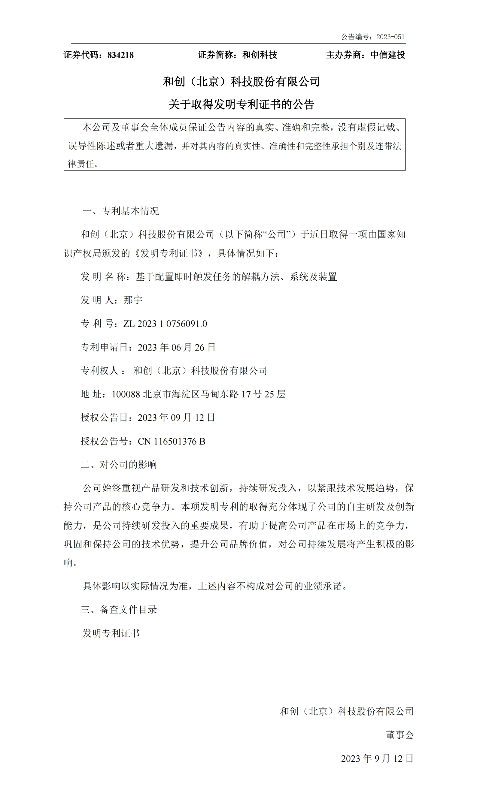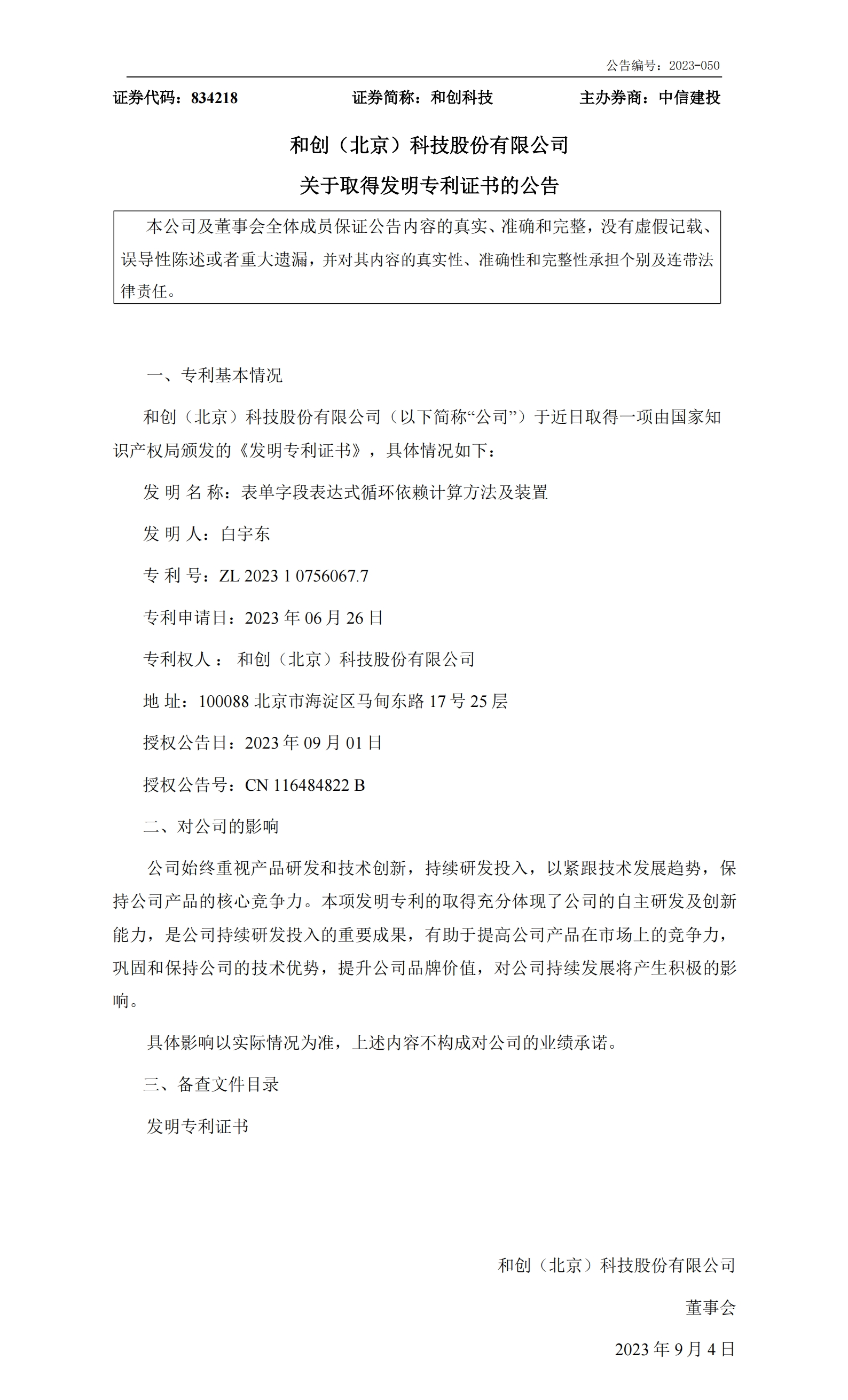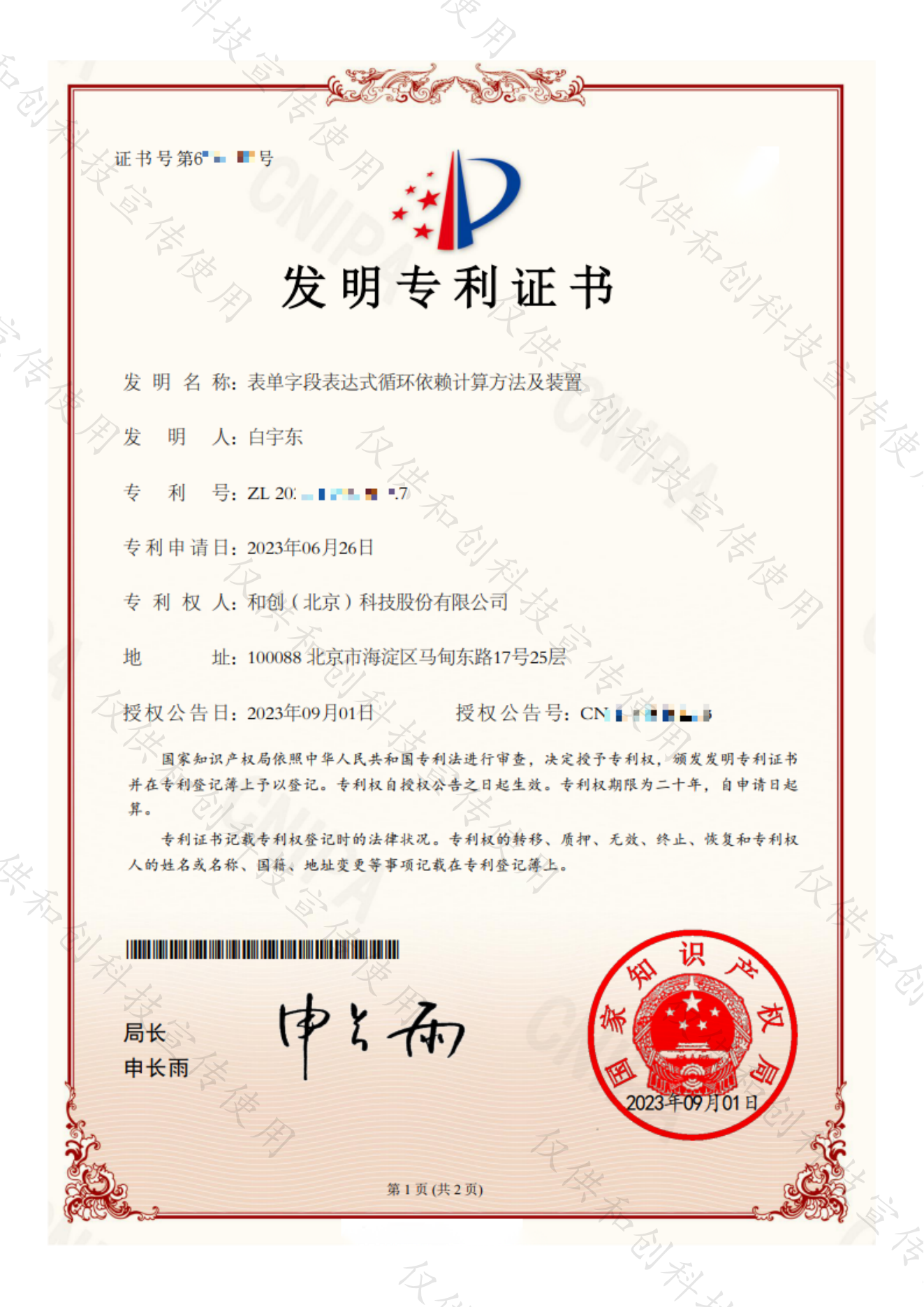 近日,和創(北京)科技股份有限公司連續取得兩項由國家知識產權局頒發的《發明專利證書》,發明名稱分別為:1.表單字段表達式循環依賴計算方法及裝置;2.基于配置即時觸發任務的解耦方法、系統及裝置。