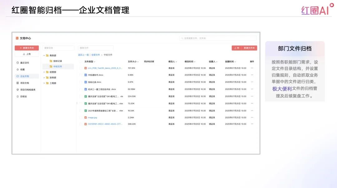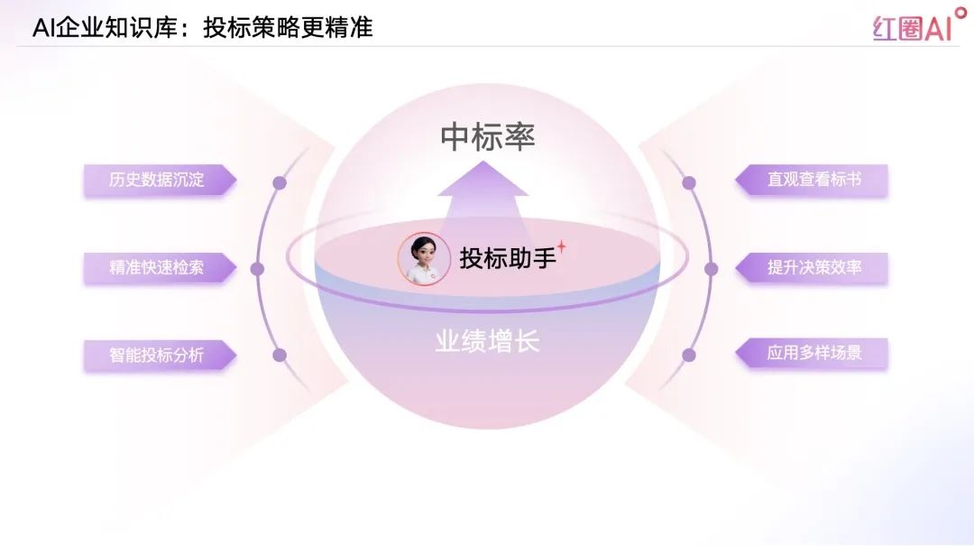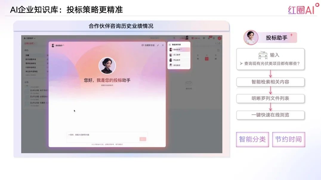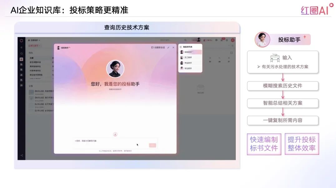 以往投標流程中,資料查找和內(nèi)容比對耗時耗力、風險頻發(fā)。紅圈AI通過快速檢索歷史標書、技術方案、成功案例等內(nèi)容,助力企業(yè)建立專屬“投標智庫”,讓策略制定更具數(shù)據(jù)支撐。