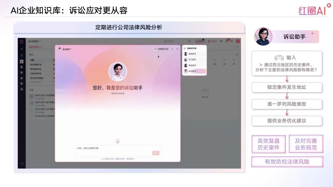 AI定期進行公司法律風險分析,訴訟助手高效復盤歷史案件,及時完善業(yè)務規(guī)范,有效防控法律風險。