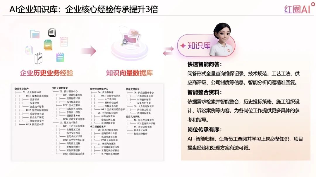 紅圈AI,以大模型+智能檢索技術為引擎,構建企業(yè)知識資產(chǎn)體系,實現(xiàn)“經(jīng)驗即問即答”,推動企業(yè)從“人找知識”走向“知識找人”。