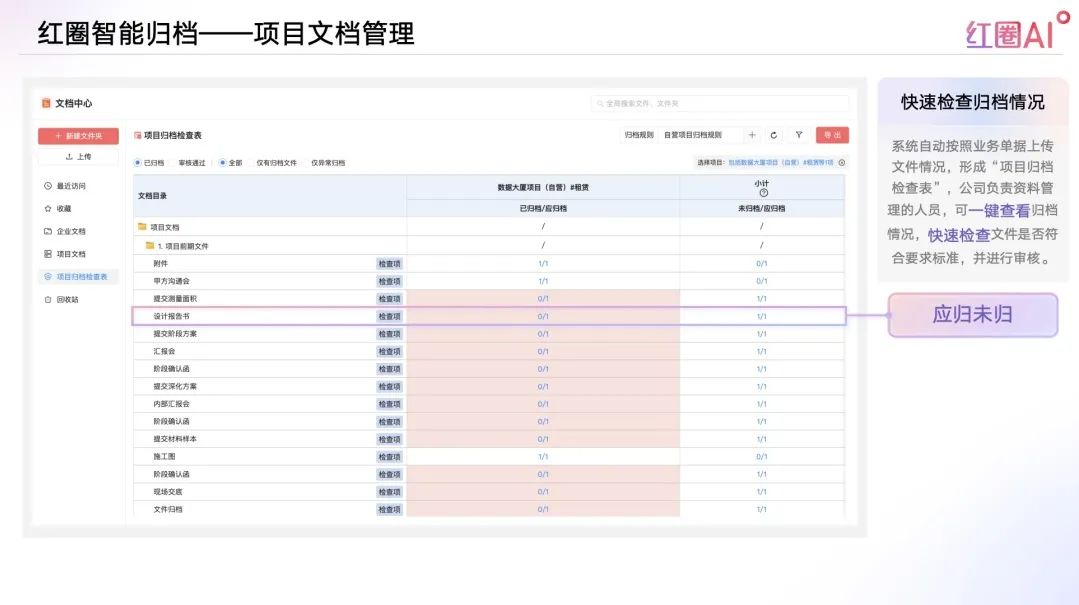 系統(tǒng)自動按照業(yè)務單據(jù)上傳文件情況,形成“項目歸檔檢查表”,公司負責資料管理的人員,可一鍵查看歸檔情況,包括“應歸未歸”、“應歸已歸”、“已歸未審核通過”等。