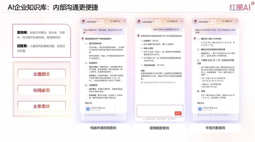 員工常見問題如流程、制度、額度等,在傳統(tǒng)體系下查詢不便、響應緩慢。紅圈AI通過自然語言對話,打造全天候問答系統(tǒng),全面提升辦公效率。