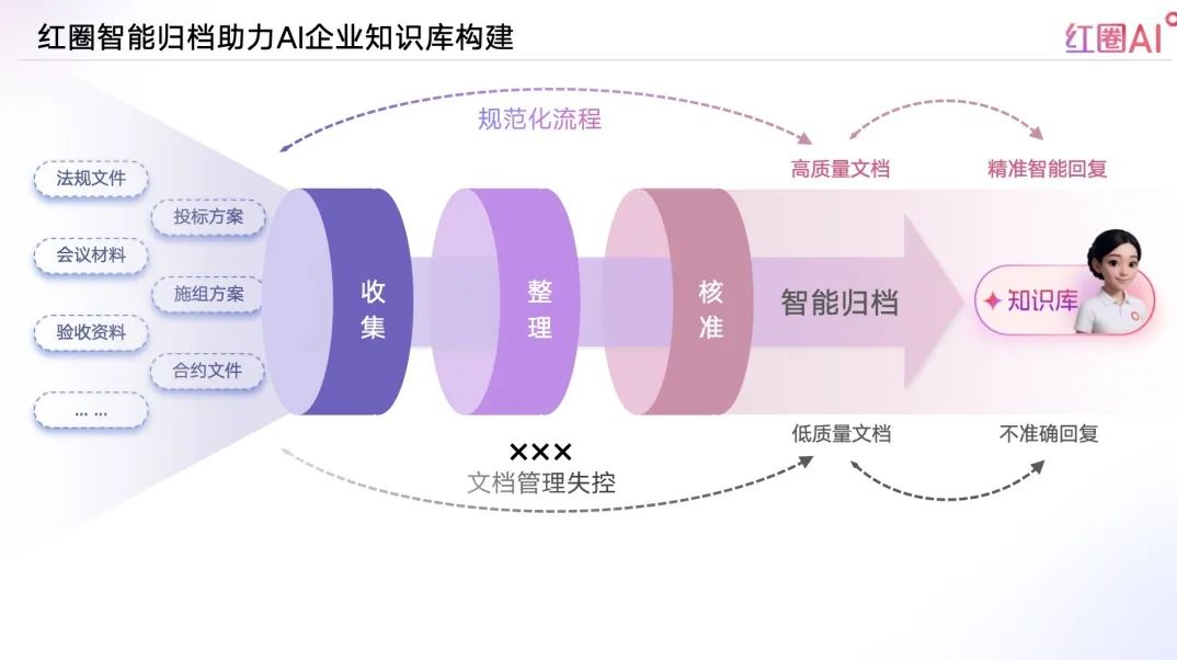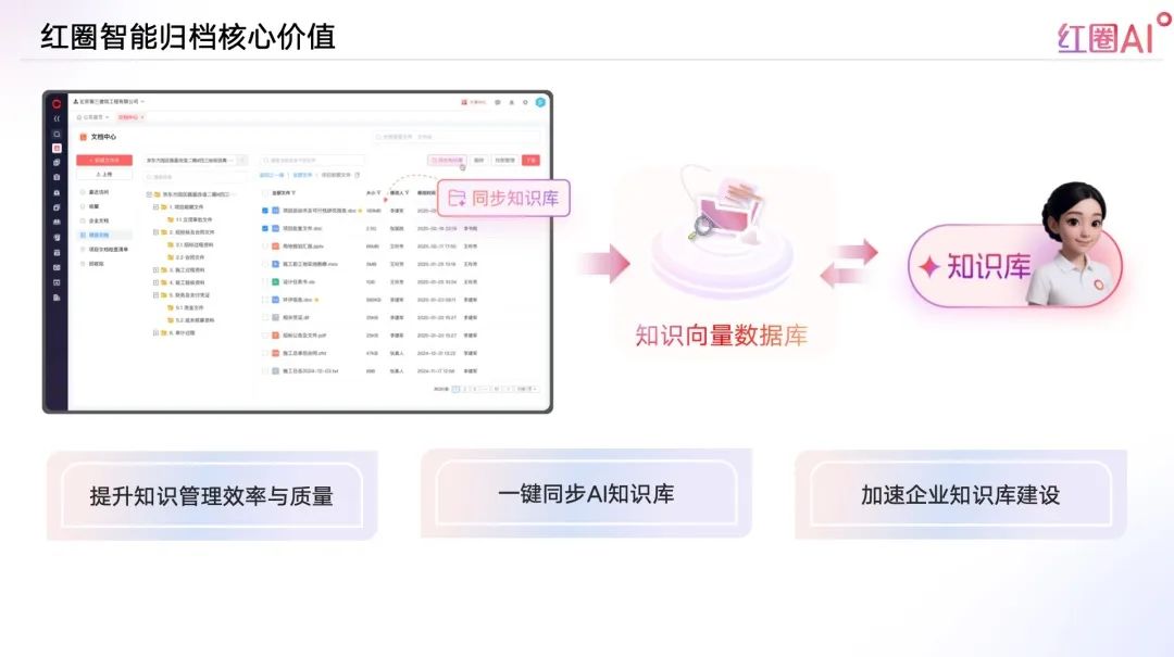 通過精準分類、統(tǒng)一歸集、秒級同步,紅圈AI幫助企業(yè)在最短時間、最低成本內(nèi)構建企業(yè)級知識體系,實現(xiàn)知識管理智能化、資產(chǎn)化、標準化。
