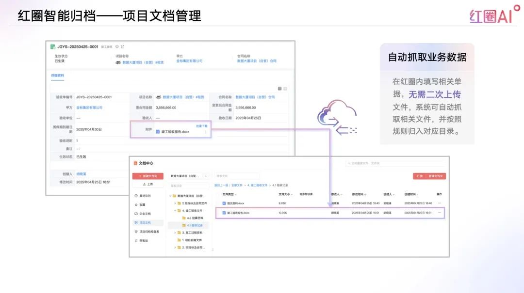 在紅圈內(nèi)填寫相關單據(jù),無需二次上傳文件,系統(tǒng)可自動抓取相關文件,并按照規(guī)則歸入對應目錄;