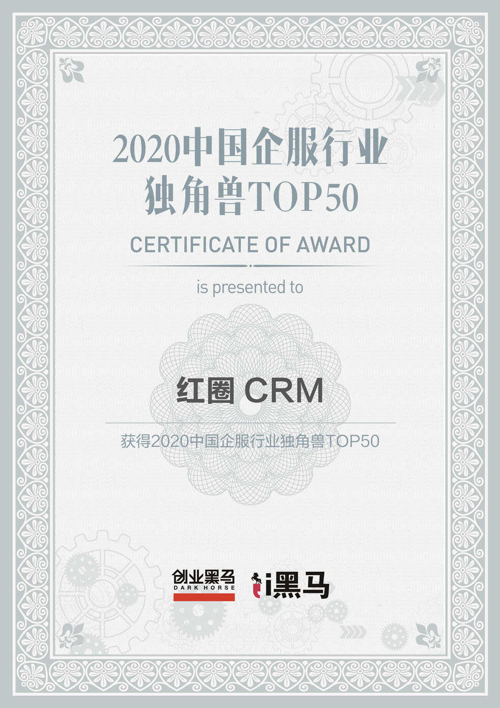 經(jīng)過(guò)多輪線上綜合評(píng)審會(huì)和最終角逐,紅圈CRM 作為 CRM 領(lǐng)域唯一代表企業(yè)入選《2020 中國(guó)企服行業(yè)獨(dú)角獸 TOP50》,該榜單在 12 月 18 日創(chuàng)業(yè)黑馬主辦的的第十三屆創(chuàng)業(yè)家年會(huì)上隆重發(fā)布。