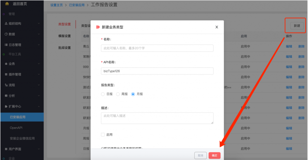 - 后臺設置:系統設置——擴展中心——已安裝應用——工作報告,類型設置支持新建類型;在模板設置中,可以按業務類型設置不同的字段和統計值;統計值設置,支持自定義名稱;