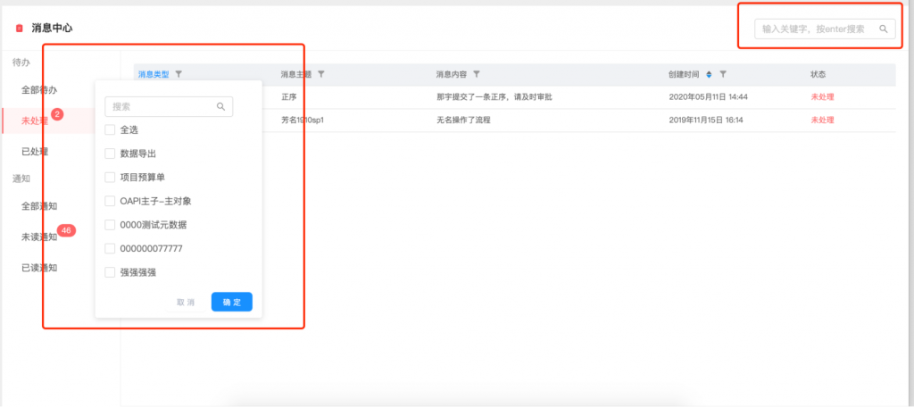 - 消息通知的類型和主題進行了規范,便于進行分類和篩選;每條消息可明確看到業務來源,主題更加清晰,大幅度減少了以“通知”為標題的消息;同時查看或處理變為整行可點擊;消息支持篩選和搜索,也可以直接搜索內容或主題;待辦和通知的狀態變化更加智能,去除了手動按鈕操作,當處理或查看詳情后,狀態會自動變化;同時優化了紅點顯示數量的刷新機制,更新更及時.