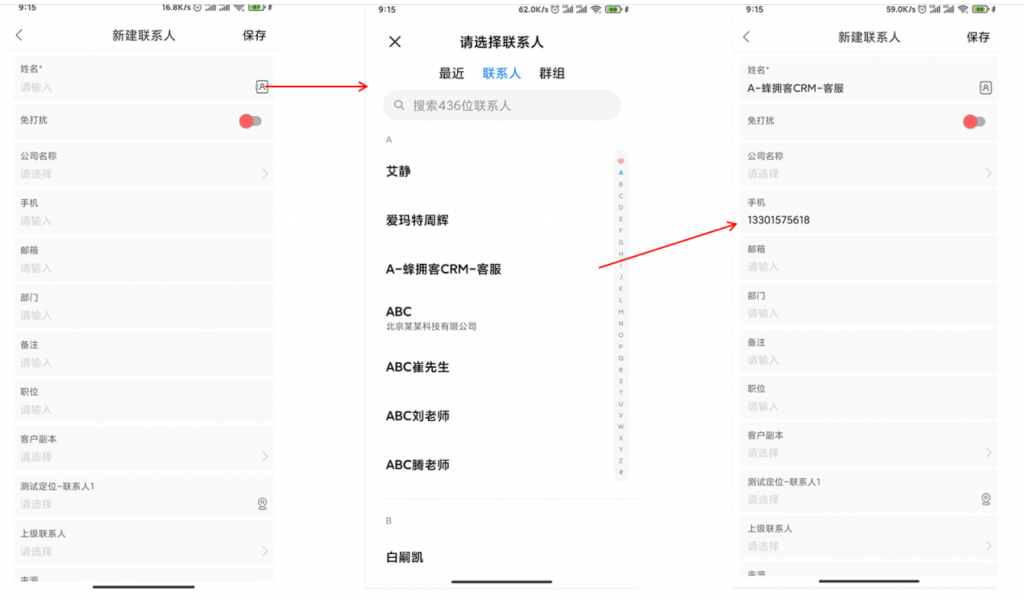 3) 手機端新建聯系人可以通過手機通訊錄選擇。