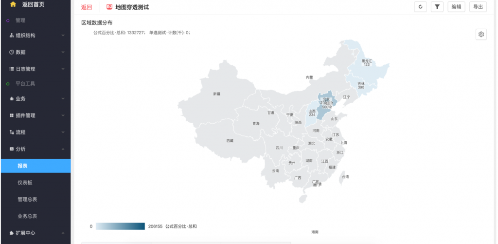 - 地圖可設(shè)置默認顯示區(qū)域,區(qū)域可進行向下鉆取,如點擊北京市,可查看北京各區(qū)的數(shù)據(jù)。每個區(qū)域的顏色代表數(shù)值的大小,顏色越深數(shù)值越大
