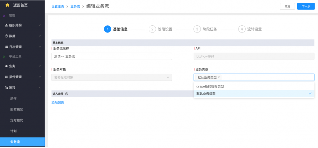 - 后臺編輯業(yè)務(wù)流配置時,支持編輯業(yè)務(wù)類型;