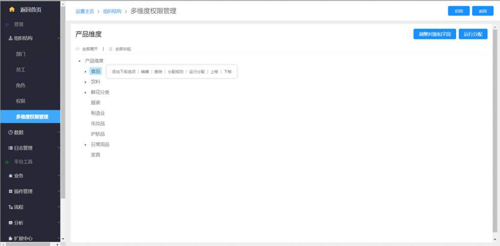 1)在后臺組織架構(gòu)-多維度權(quán)限管理,新建維度樹;創(chuàng)建時需指定適用對象(需要擴(kuò)展權(quán)限的對象)和規(guī)則字段(權(quán)限劃分的條件依據(jù))