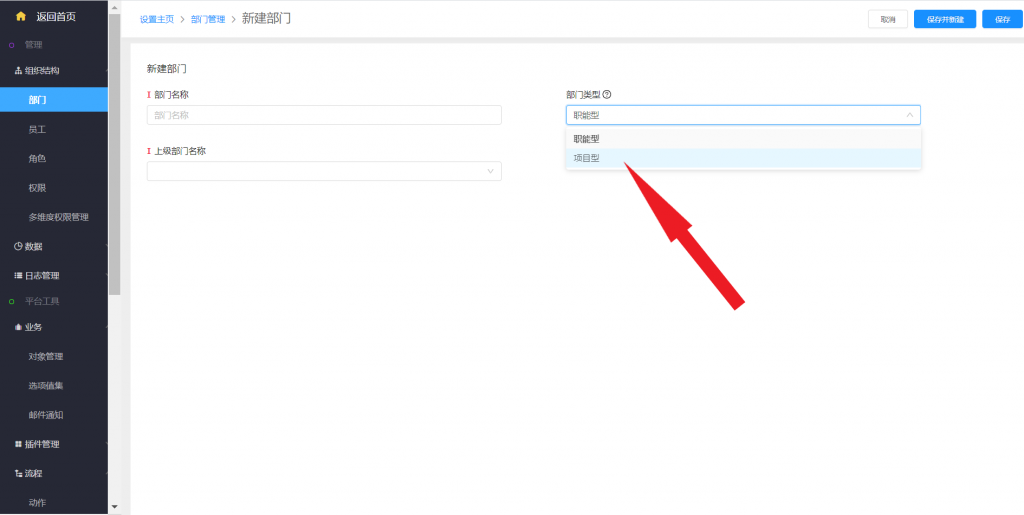 后臺部門設(shè)置,增加部門類型,分為職能型和項目型