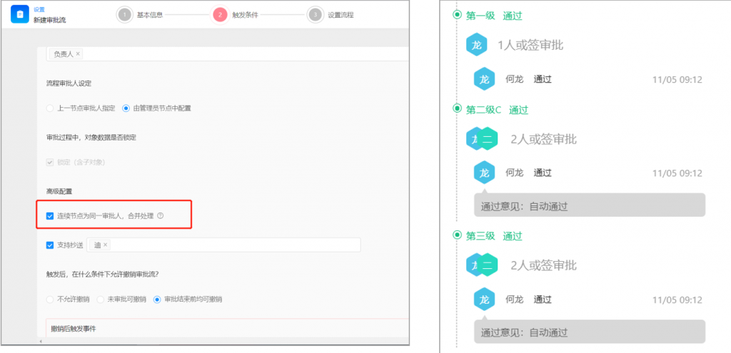增加高級設(shè)置:連續(xù)節(jié)點為同一審批人,合并處理;第二級審批節(jié)點會自動通過