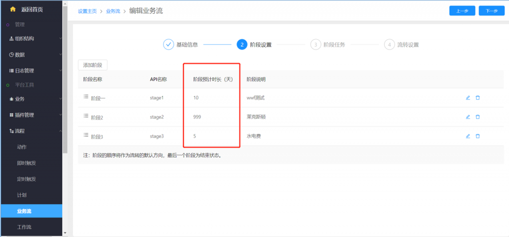 業(yè)務(wù)流階段設(shè)置中 增加階段計劃時長,并在業(yè)務(wù)流組件中展示計劃和實際時長;支持用階段任務(wù)驅(qū)動階段自動流程