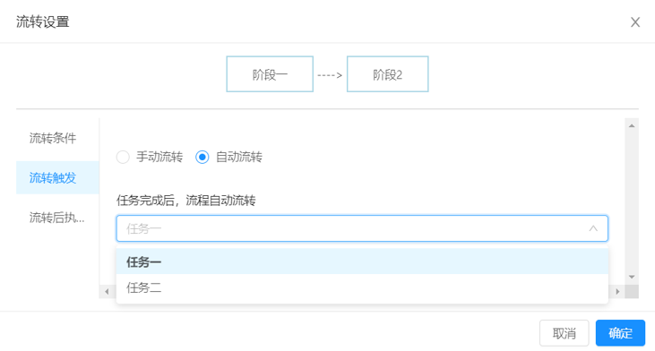 業(yè)務(wù)流流轉(zhuǎn)設(shè)置中,流轉(zhuǎn)觸發(fā)中增加 自動流轉(zhuǎn),可以用當(dāng)前階段的某個任務(wù)作為觸發(fā)動作;
