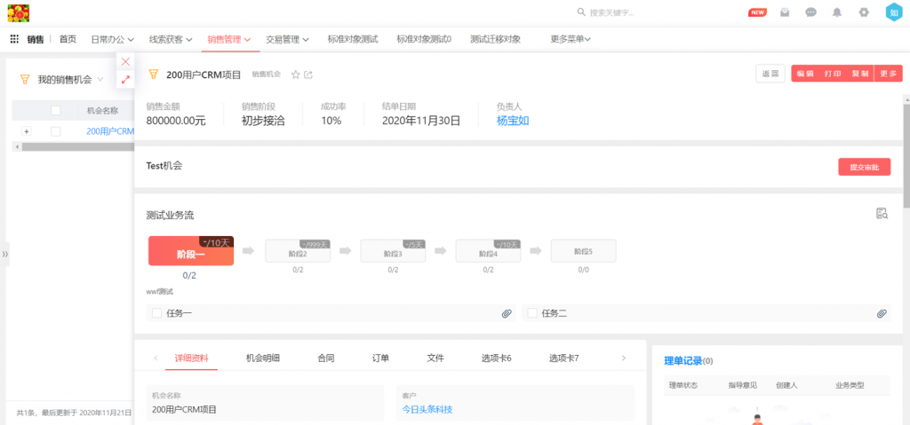 業(yè)務(wù)流階段上顯示階段預(yù)計時長及實際時長,實際時長在階段流轉(zhuǎn)出后自動計算停留天數(shù)