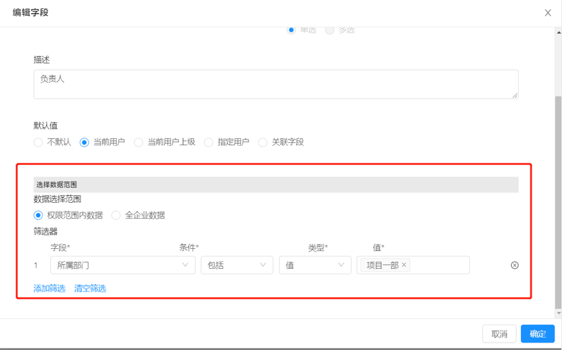 負(fù)責(zé)人或自定義的員工字段,支持設(shè)置篩選條件,在錄入資料選人時,可縮小選取范圍