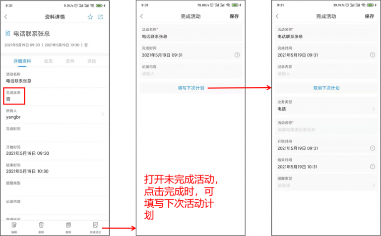 填寫的下次計劃,類型和當前活動類型一致,可修改