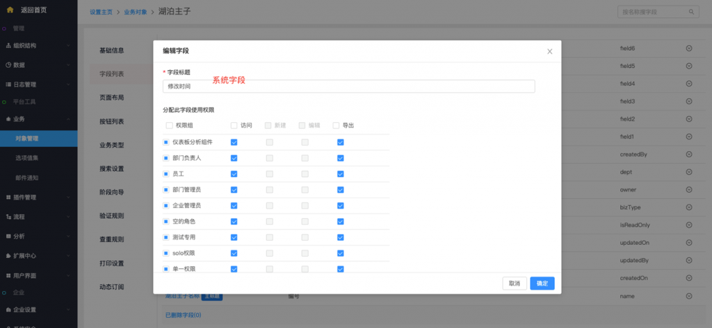 - 系統字段及按鈕修改權限配置:系統字段、標準字段(所屬部門及負責人)、按鈕支持在編輯時修改權限