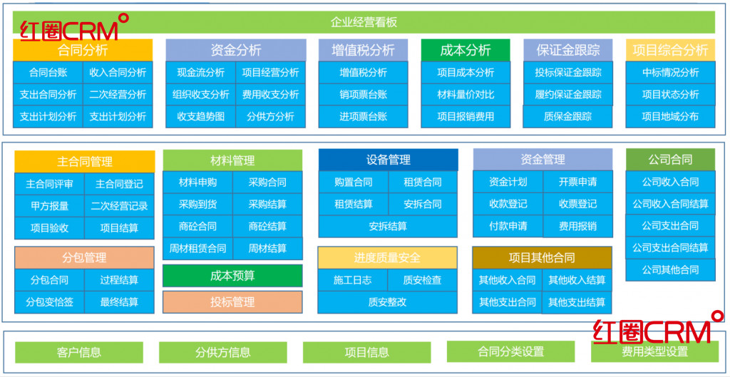 紅圈CRM v2.0專門服務于建筑工程企業項目管理,功能更聚焦于建筑工程項目經營,六大工程業務閉環,為建筑工程企業的經營結果負責。