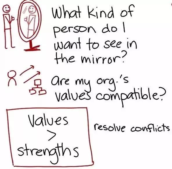 一個人的工作方式和他的長處很少發生沖突,相反,兩者能產生互補。但是,一個人的價值觀有時會與他的長處發生沖突。