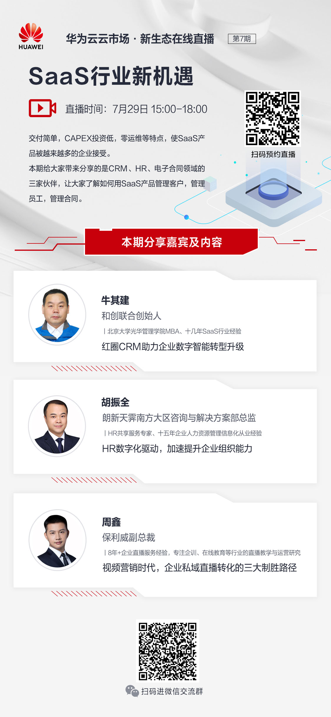 【云直播】華為云云市場(chǎng).新生態(tài)在線直播系列活動(dòng)第七期--《SaaS行業(yè)新機(jī)遇》7月29日下午3點(diǎn)