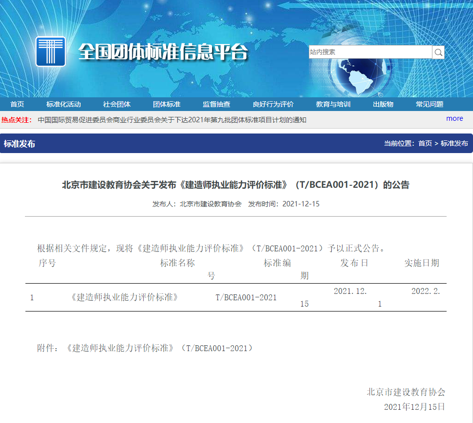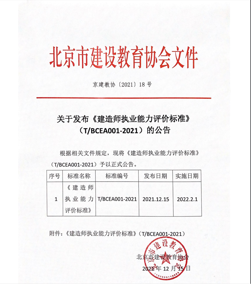 2021年12月15日,北京市建設(shè)教育協(xié)會(huì)發(fā)布了《建造師執(zhí)業(yè)能力評(píng)價(jià)標(biāo)準(zhǔn)》(T/BCEA001-2021)公告。該標(biāo)準(zhǔn)將在2022年2月1日起開始實(shí)施。 標(biāo)準(zhǔn)可作為管理機(jī)構(gòu)、用人單位對(duì)建造師管理及聘用的依據(jù),并可作為建造師行業(yè)能力發(fā)展標(biāo)準(zhǔn)的指引,助力工程建筑企業(yè)進(jìn)行數(shù)字化轉(zhuǎn)型升級(jí)。
