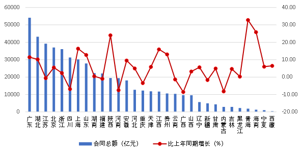 2023年上半年,廣東、湖北、江蘇、北京、浙江、四川、上海等7個地區建筑業企業合同總額均超過30000億元,分別達到54142.75億元、43200.05億元、39176.44億元、37001.58億元、36004.49億元、31243.04億元和30146.28億元。合同總額超過 20000 億元的還有山東、湖南、福建3個地區。合同總額同比增長最快的是青海,達到了32.80%。海南、陜西、上海和江西的增幅也都超過了15%。9個地區合同總額出現負增長,其中廣西、內蒙古的負增長均超過8%(圖6)。