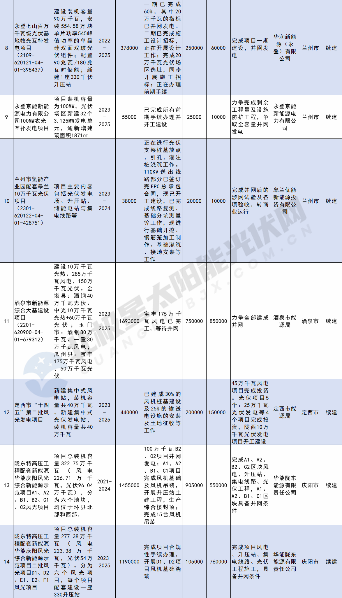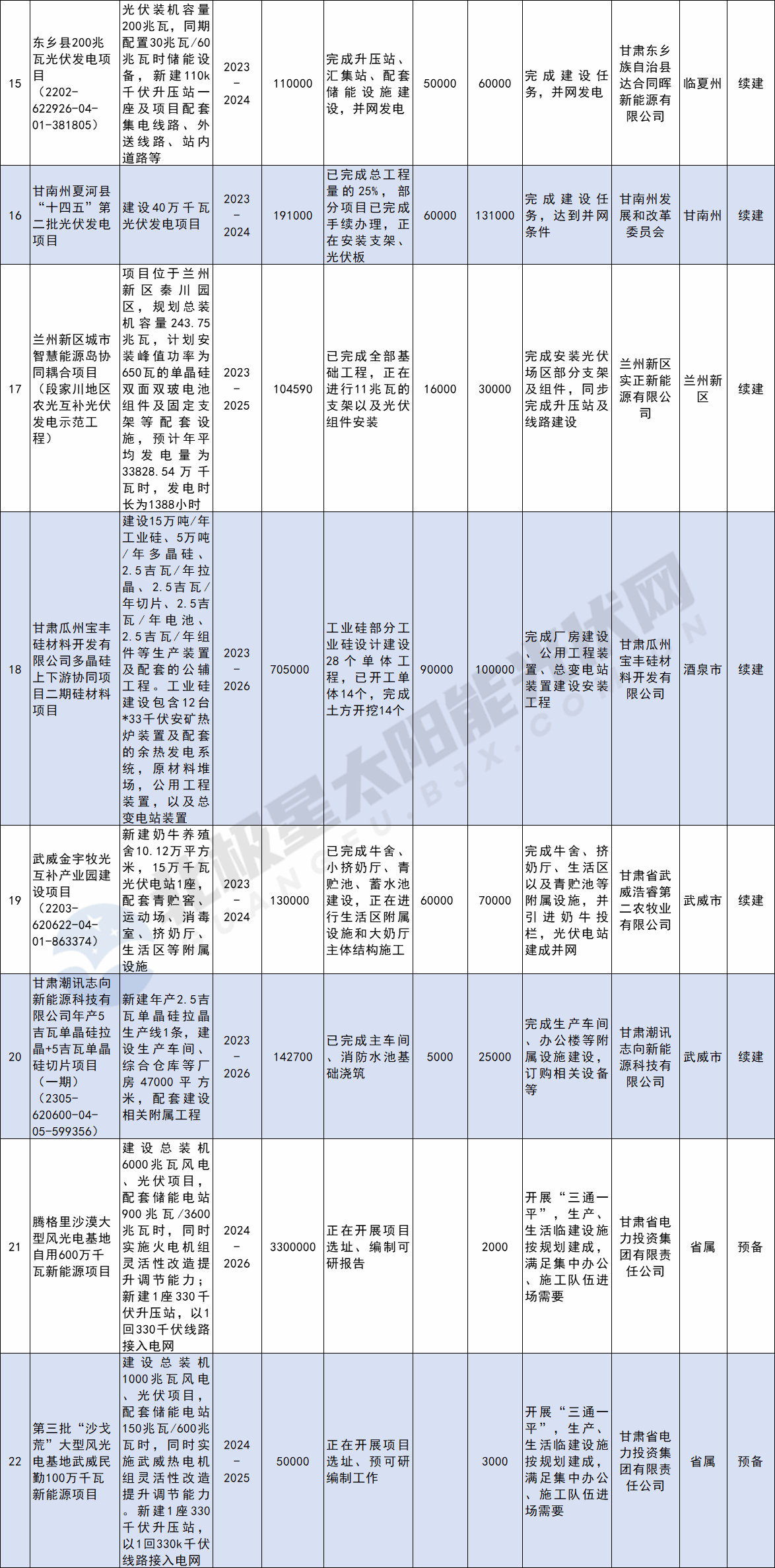 2023年12月22日,甘肅省發改委發布關于征求《甘肅省2024年省列重大建設項目投資計劃(草案)》意見的函,經梳理統計,共涉及11個光伏項目,總投資額達1232.329億元。項目詳情如下: