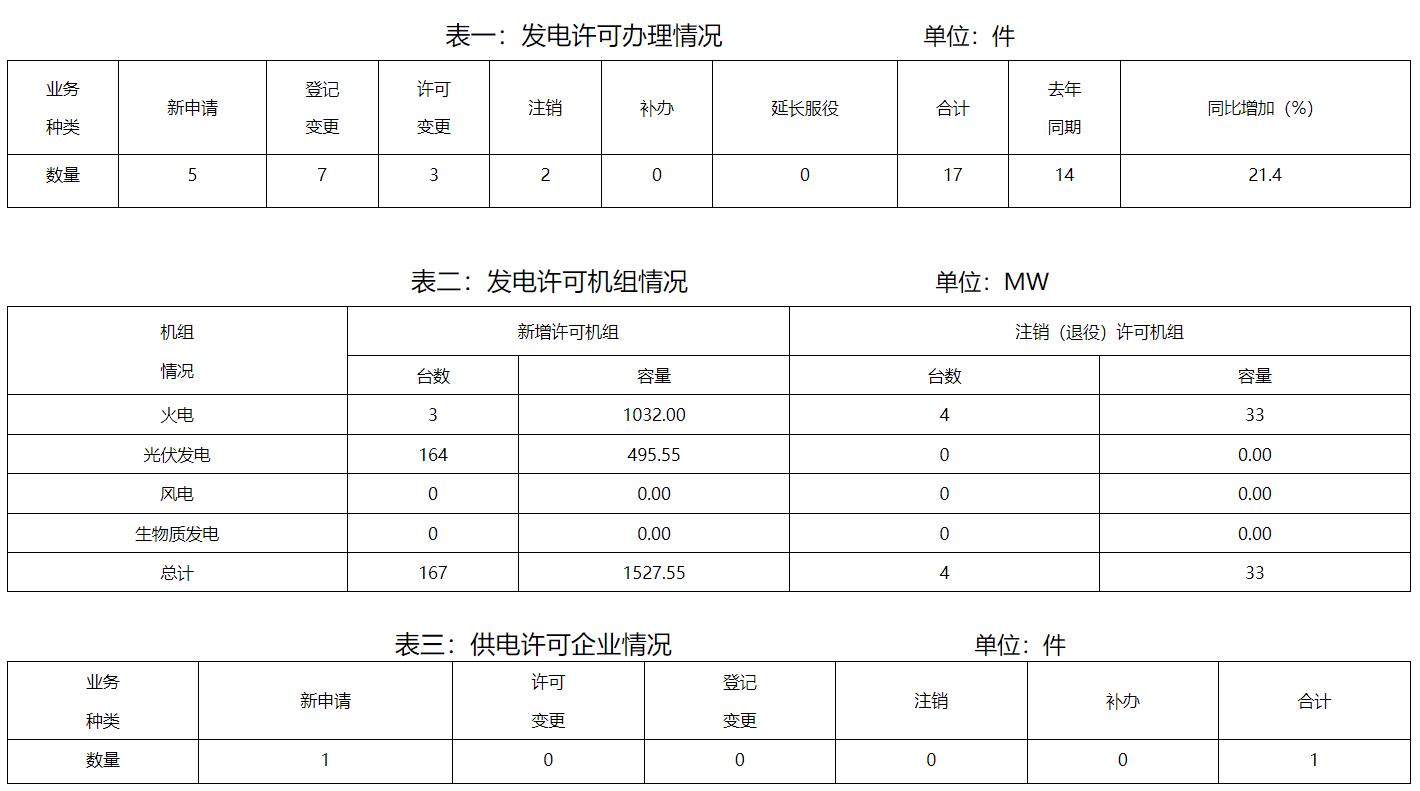1月份,全省辦理電力業務許可證(發電類)共計17件,其中新申請5件,許可事項變更3件,登記事項變更7件,注銷2件。新增許可機組167臺(發電單元)總容量1527.55MW。