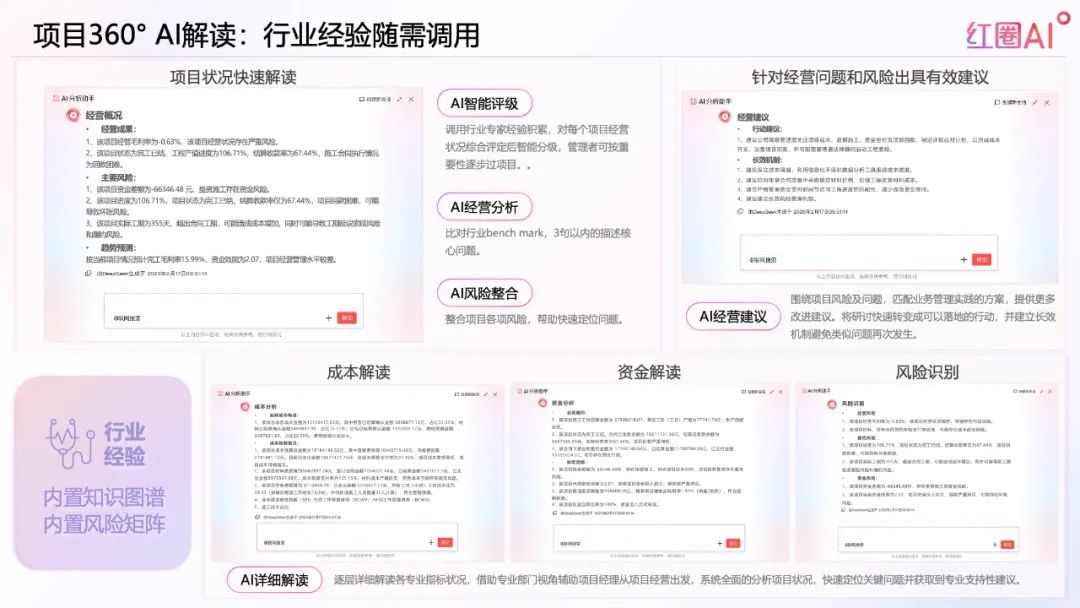 紅圈AI正在成為工程企業快速完成智能化躍遷的重要工具。它通過整合經營數據、自動化風險識別、智能知識檢索,幫助企業以更低的成本、更高的效率滿足政策要求,并從中獲得管理透明化和決策科學化的收益。