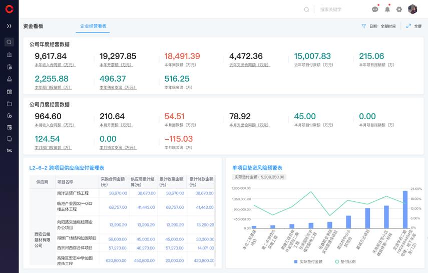 ○ 財務管理模塊(資金風險防火墻): 財務實現合同-結算-收開票-收付款全鏈路數據串聯。老板審批付款時,可清晰掌握公司、項目、供應商層級的應收、應付、墊資數據及公司資金余額,洞悉真實可支配資金。同時顯示成本花費情況,審批時自動關聯合同成本,預警成本超支風險。