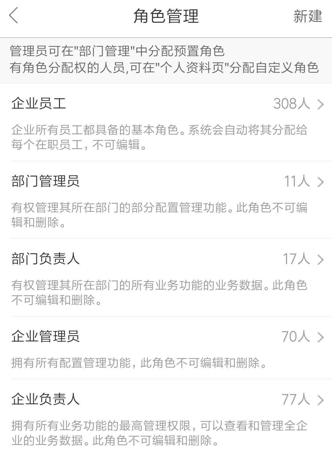 在角色管理中,會(huì)默認(rèn)有五種角色:企業(yè)負(fù)責(zé)人、企業(yè)管理員、部門負(fù)責(zé)人、部門管理員、企業(yè)員工。